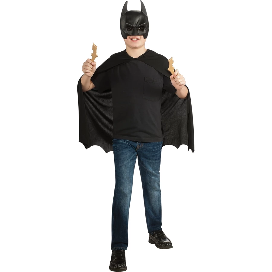 BATMAN CHILD ACCESSORY SET. A very quick and easy Batman costume. Black mask, black cape and two batarangs. One size fits most children.