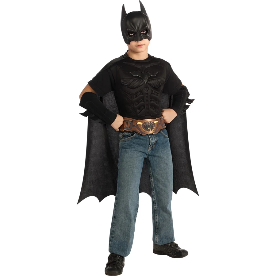 BATMAN COSTUME KIT CHILD SMALL. A very quick and easy Batman costume for your child. Muscle chest piece with attached belt and cape, mask, arm gauntlets. All black with printed gold belt. Fits child small sizes 4-6.