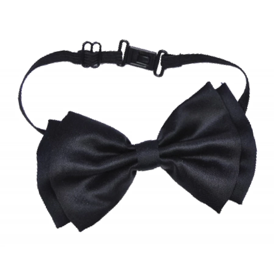 BOW TIE BLACK. Satin bow tie with black elastic adjustable band which has a push in snap closure.
