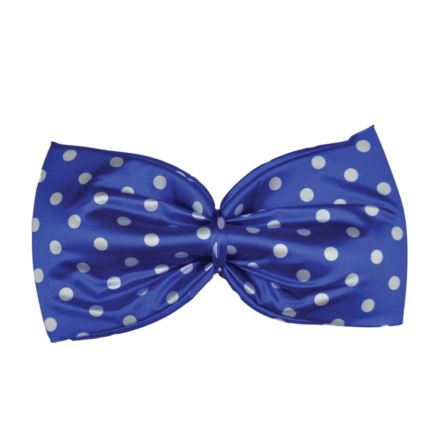 BOW TIE JUMBO POLKADOT BLUE. Polyester satin, 15 inch polka dot bow tie with elastic neck band.