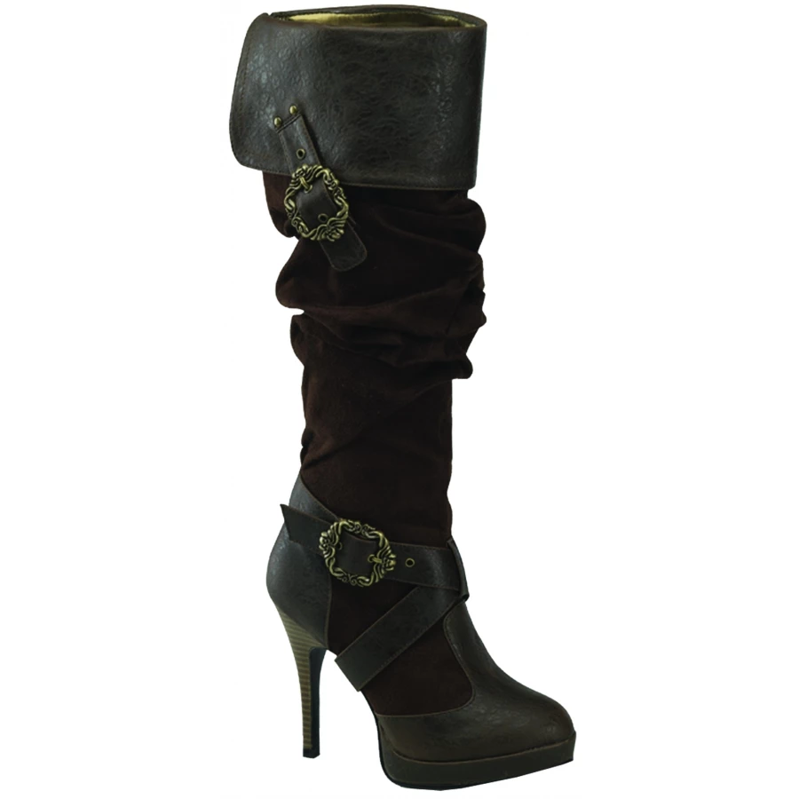 CARIBBEAN 216 WMN BROWN 9. Take your sexy pirate costume to the next level with these magnificent knee high platform boots. They feature brown slouched faux-suede and a thick fold over polyurethane cuff that looks like distressed leather. These stunning female pirate boots are adorned with intricate octopus buckles, faux-leather straps, and a wood-like 4 -” heel. And the best part-they are easy to get on and off with the full-length inner leg zipper. Get ready to turn heads! Brown. Women’s size 9.