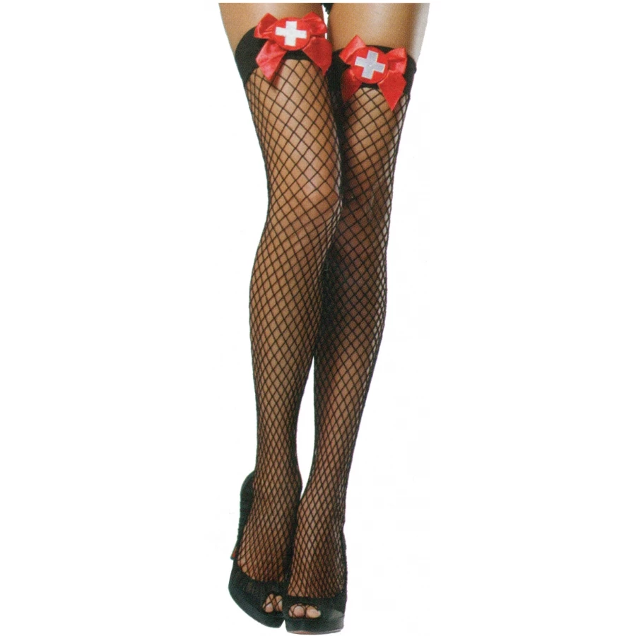 FISHNETS THI HI NURSE BK/RD BW. Industrial NetTM thigh highs with contrast satin bow and nurse badge applique. ONE SIZE FITS MOST.