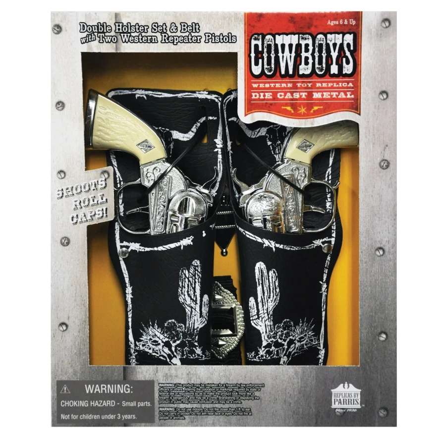 GUN SET CHILD DOUBLE. Decorated leather holsters with belt. Includes two die cast repeater cap pistols. overall length 10 inches Uses paper roll caps, not included.