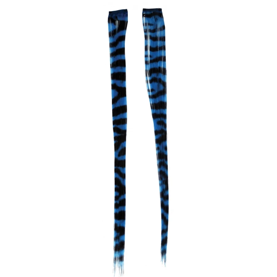 HAIR EXTENSION TURQUOISE ZEBRA. 2 piece clip-in synthetic hair extensions. Can be curled, crimped, straightened and blow dried. Remove tangles with your fingers or comb. Wash gently, rinse in cool water and hang to dry. Do not brush or comb while wet. Don’t dye or process or use excessive heat. 11 1/2 inches long.