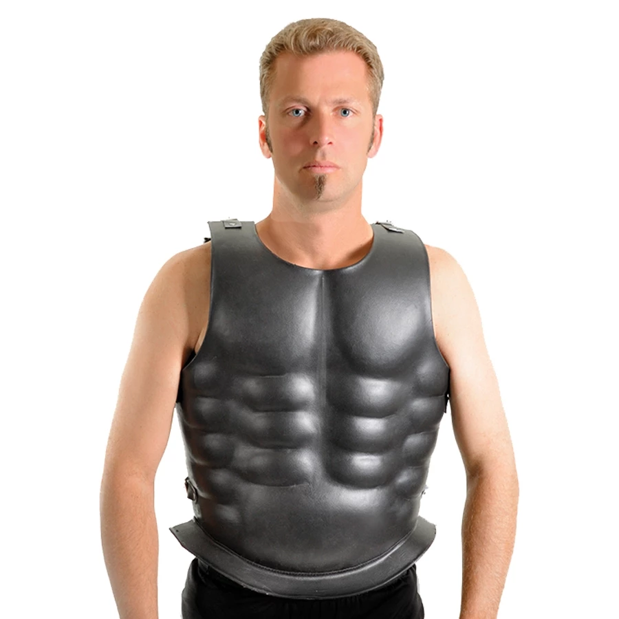 LEATHER MOUNTED MUSCLE CUIRASS. Body armor cast to fit the wearer’s torso and designed to mimic an idealized human physique commonly depicted in Greek and Roman art. This simple cuirass was worn in combat situations. 18 gauge steel with leather adjustable side and shoulder straps, menacing black color. 4.1 lbs. Fits 44-48 inch chests.