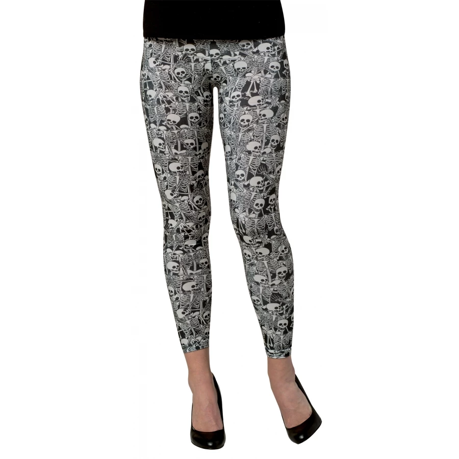 LEGGINGS SKELETONS SM ADULT. Great spooky leggings to add to your Halloween wardrobe! These super cute leggings are made from polyester and have skeletons printed all over. Wear them all Halloween season long or add some skeleton makeup for a quick costume. Fits Adult Small (waist 24-27″)