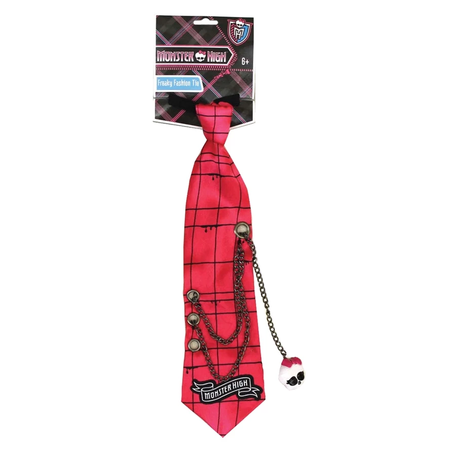 MH FREAKY FASHION TIE CHILD 6+. Your child can look like their fave Monster High character with this sharp-looking poly-cotton clip-on tie with pink and black squares and Monster High charm with holes in material with chains running through holes. One size fits most.
