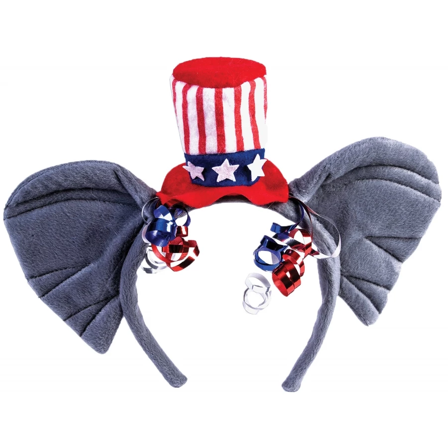 REPUBLICAN HEADBAND. Show your true colors with this great elephant ears headband with an attached mini Uncle Sam hat and red, white, and blue curly ribbons. One size fits all.
