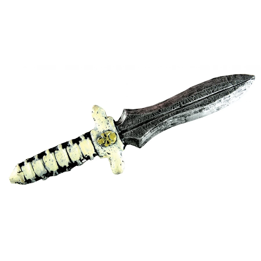 Handle appears to be a human spine, with skull trim. Realistic, but made of a new flexible foam material. Child friendly.