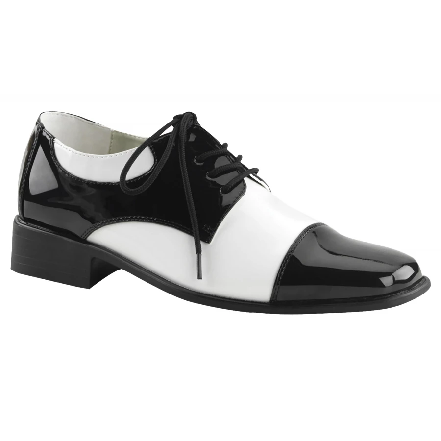 SHOE OXFORD BK AND WT MEN SM. Men’s black and white patent moc croc pattern lace-up shoes. One inch heel. Adult size 7-8.