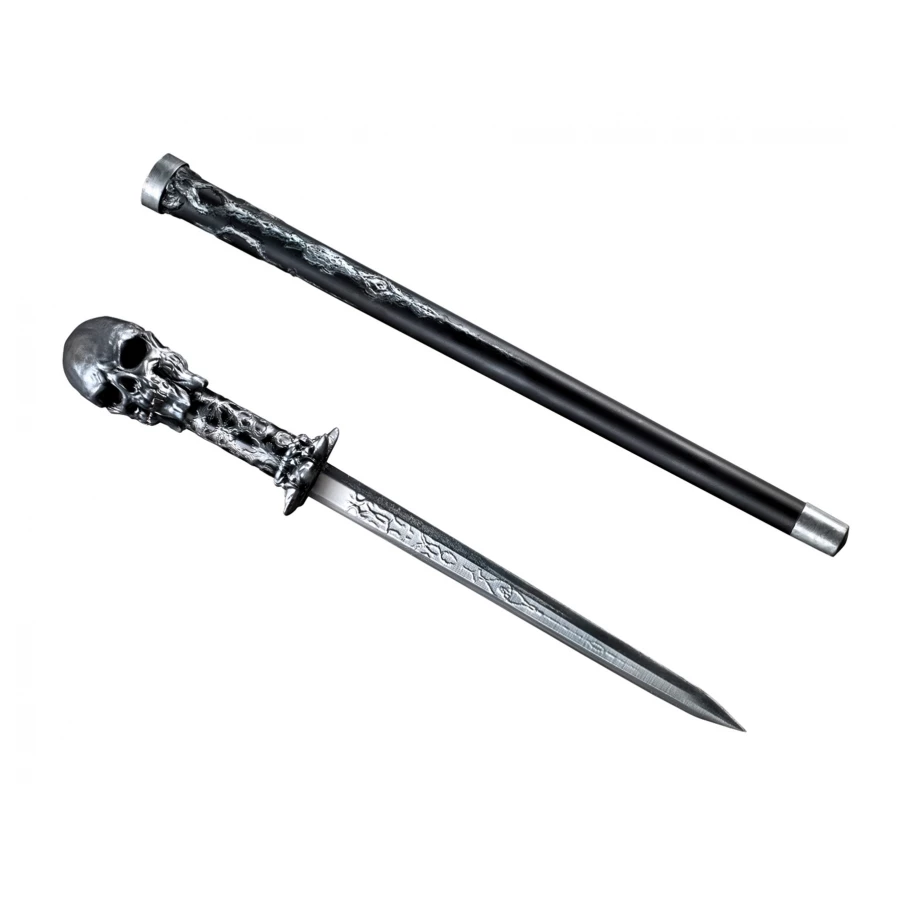 SKULL CANE SWORD. Decorative gothic designed cane with skull handle has a hidden sword inside the cane! Nice detailing. Length is 24 inches.