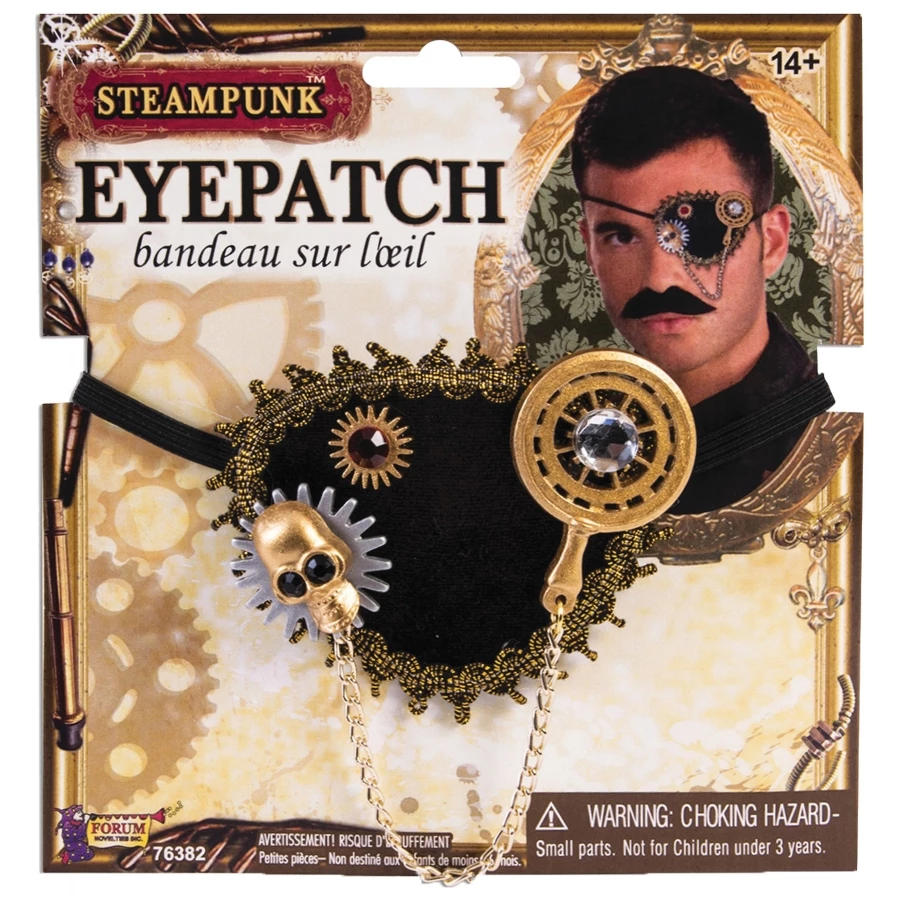STEAMPUNK EYEPATCH. You will love this decorative eyepatch with gold and silver gears and a gold lace trim as well as a dangling chain! Elastic headband allows for a comfortable fit. Perfect accessory for your Victorian Industrial look! One size fits most.