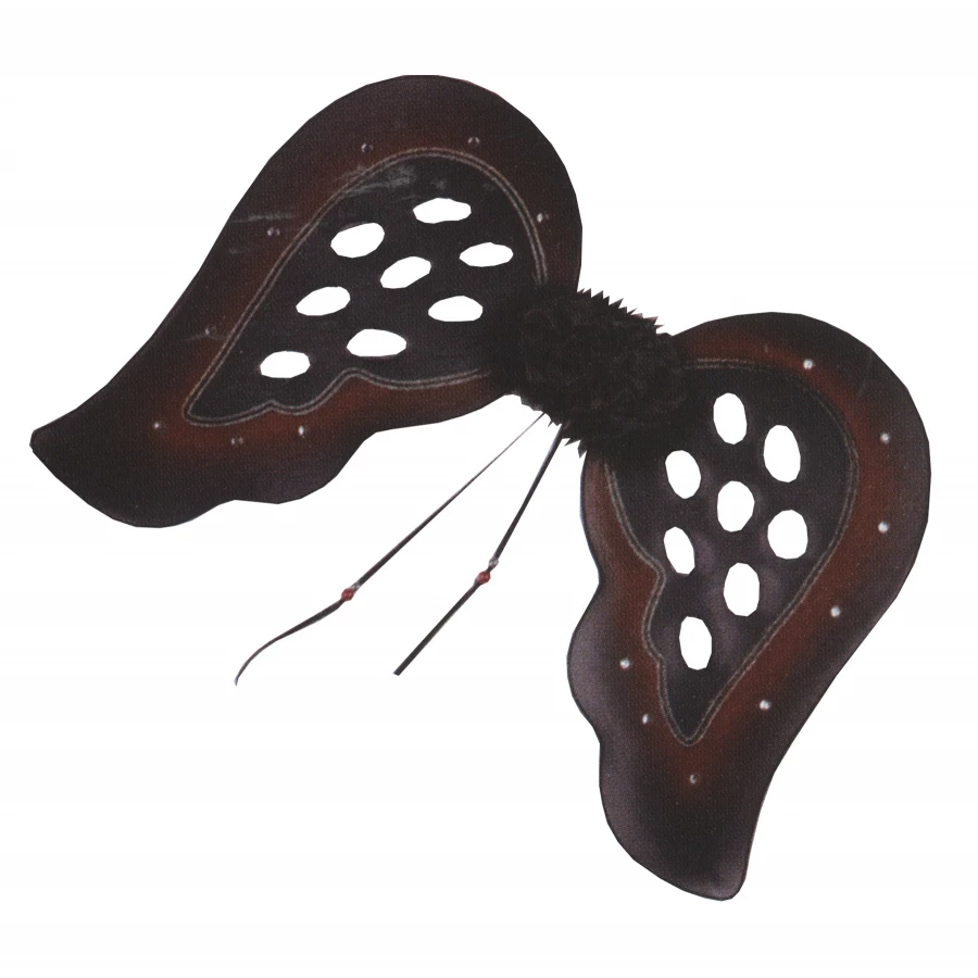 WINGS GOTH BK/BURGUNDY TEARS. Black wings with teardrop-shaped cutouts and burgundy trim. Approximately 18 1/2 at widest point, and 14 1/2 from top to bottom.