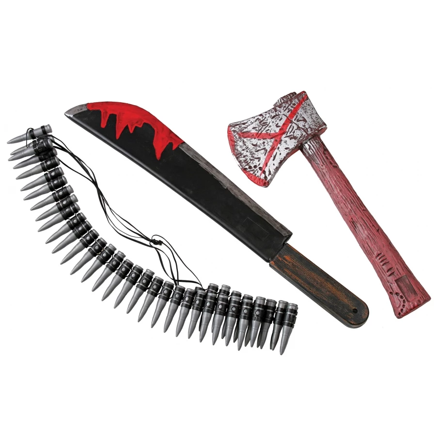 ZOMBIE HUNTING KIT. 3 Piece kit includes bloody machete, bloody axe, and half bandolier with strap. Tie on Card packaging.